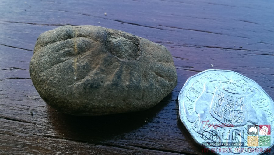 Measuring 5 cms by 3 cms we are of the belief that the stone was cut in half and we suspect the other hypothetical half will also carry an engraved symbol of equal importance. It seems that the vertical 4 centimetre engraved line on the right-hand side of the rock was chiseled into the rock first. The three rays that intersect appear to go over the top of the underlying line, what that means is of course unknown. That same line leads to the back side, and there seem to be two possible lines, but so worn is this side that outside suggesting there is a good chance the narrative continues on the flip-side, nothing else can be stated with confidence.